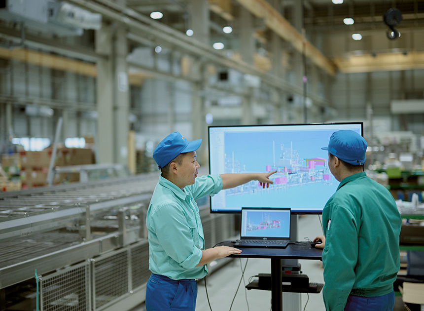 Digital technologies such as state-of-the-art 3D modeling, 3D point cloud data and line simulation software are used for detailed product design and performance prediction. This contributes to improving product performance and quality as well as shortening product development time. In addition, in the coordination of the entire production line, these technologies are actively used to achieve overall optimization.