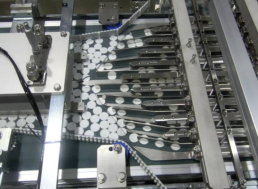 Tablets supplied from the tablet pressing machine are aligned and grouped, positioned, sealed bag in 4 sides, collected into a predetermined number, and sent to the next process. By carefully handling the tablets, this quality-oriented system prevents the tablets from cracking or chipping at a high speed.