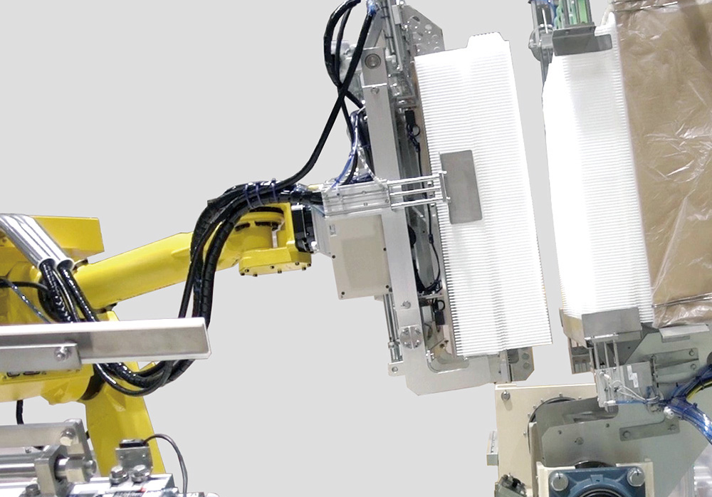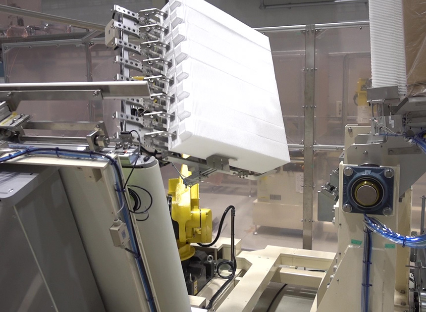 Trays packed in cardboard boxes (for natto, tofu, etc.) are automatically taken out and set in the filling machine.