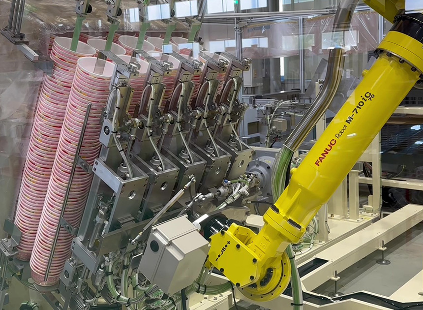 Cups packed in cardboard boxes (for cup noodles, cup soup, etc.) are automatically taken out and set in the filling machine.