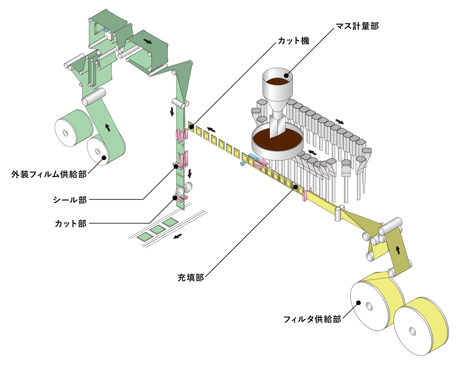 ドリップコーヒーの粉を高速・高精度に充填包装するシステムです。コーヒーの酸化を防ぐため、窒素充填を行います。