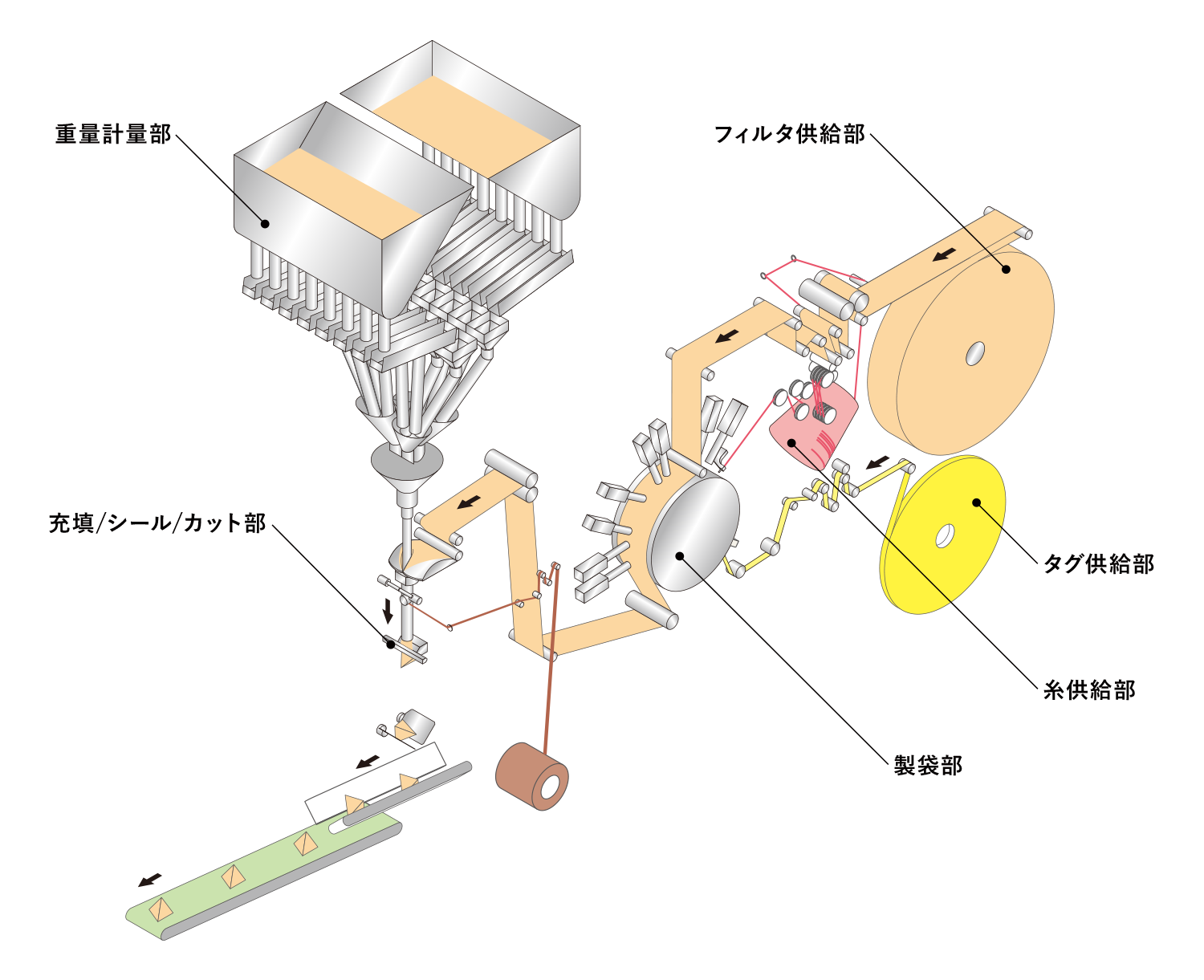 金属製ホッチキスを使用せず、糸・タグをフィルタ(生分解性フィルタに対応)に溶着、充填、シールを行う高速型システムです。
