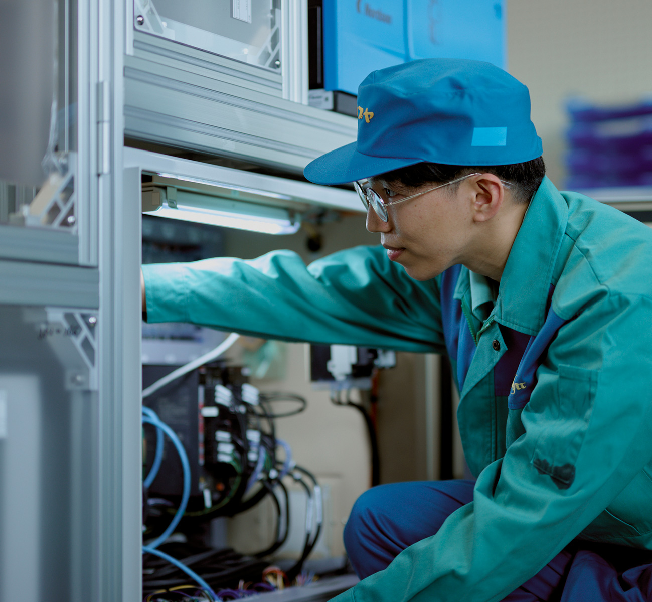 モーターをはじめとした装置の担当者となり、ハード設計やソフト設計、調整、据付までが業務です。装置の設計から調整までは、工場の機械製造の場で行います。お客様の工場へ据付する時は出張することもあります。